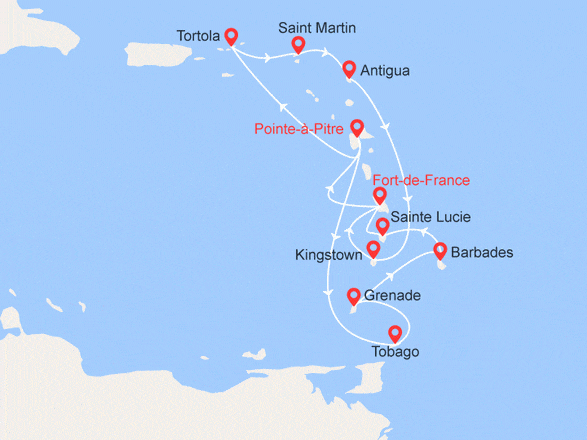 Martinique (Fort de France) - Guadeloupe (Pointe à Pitre) - Iles Vierges Britanniques (Tortola) - Antilles (St Martin) - Antigua (Antigua et Barbuda) - St Vincent et les Grenadines (Kingston) - Trinité et Tobago (Scarborough) - Antilles (Grenade) - La Barbade - Antilles (Ste Lucie) voir +