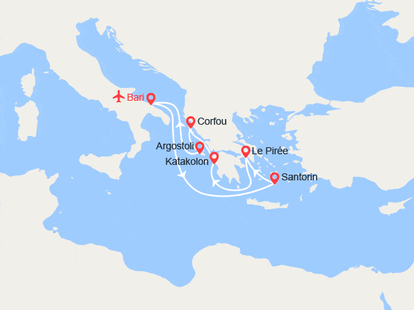 Paris - Italie (Bari) - Santorin (Cyclades) - Athènes (Le Pirée) - Olympie (Katakolon) - Iles grecques (Corfou) - Iles grecques (Argostoli) voir +