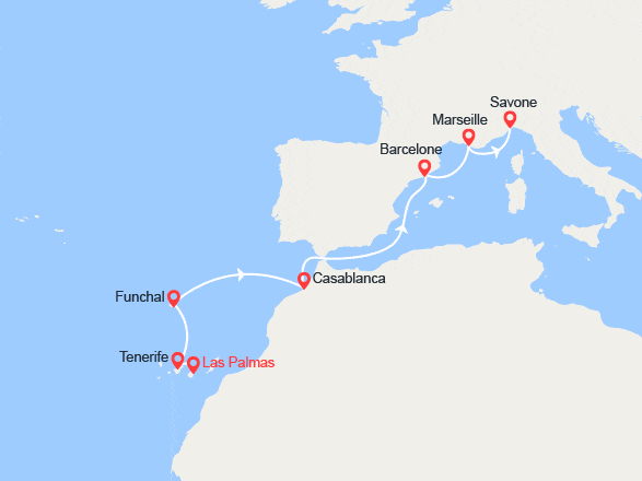 Iles Canaries (Las Palmas de Gran Canaria) - Iles Canaries (Santa Cruz de Tenerife) - Madère (Funchal) - Casablanca - Barcelone - Marseille - Italie (Savone) voir +