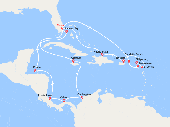Miami - Jamaïque (Falmouth) - Colombie (Carthagène) - Panama (Colon) - Costa Rica (Puerto Limon) - Honduras (Ile de Roatan) - Bahamas (MSC Ocean Cay) - Iles Vierges Américaines (Charlotte-Amalie) - St Kitts et Nevis (Basseterre) - St Martin (Philipsburg) - Antigua et Barbuda (St John's) - Porto Rico (San Juan) - République Dominicaine (Puerto Plata) voir +