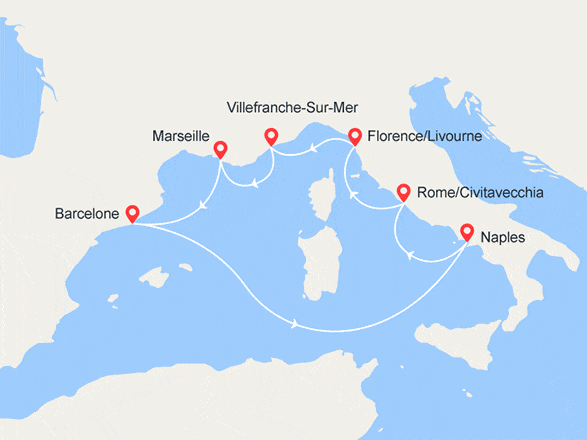 Barcelone - Naples - Rome (Civitavecchia) - Florence (Livourne) - Côte d'Azur (Villefranche-sur-mer) - Marseille voir +