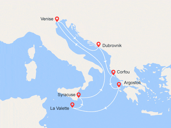 Venise - Croatie (Dubrovnik) - Iles grecques (Corfou) - Grèce (Argostoli) - Malte (La Valette) - Sicile (Syracuse) voir +