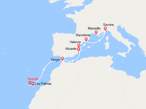 Iles Canaries (Santa Cruz de Tenerife) - Iles Canaries (Las Palmas de Gran Canaria) - Maroc (Tanger) - Espagne (Alicante) - Espagne (Valence) - Barcelone - Italie (Savone) - Marseille voir +