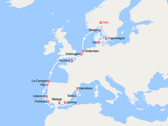 Oslo (Norvège) - Danemark (Skagen) - Copenhague (Danemark) - Allemagne (Kiel) - Rotterdam (Pays Bas) - Belgique (Zeebruges) - Honfleur (Normandie) - Espagne (La Corogne) - Espagne (Vigo) - Lisbonne - Portugal (Portimao) - Espagne (Malaga) - Espagne (Almeria) - Ibiza - Barcelone voir +