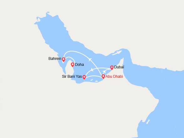 Abu Dhabi (Emirats Arabes Unis) - Dubaï - Emirats Arabes Unis (Sir Bani Yas) - Bahrein - Qatar (Doha) voir +