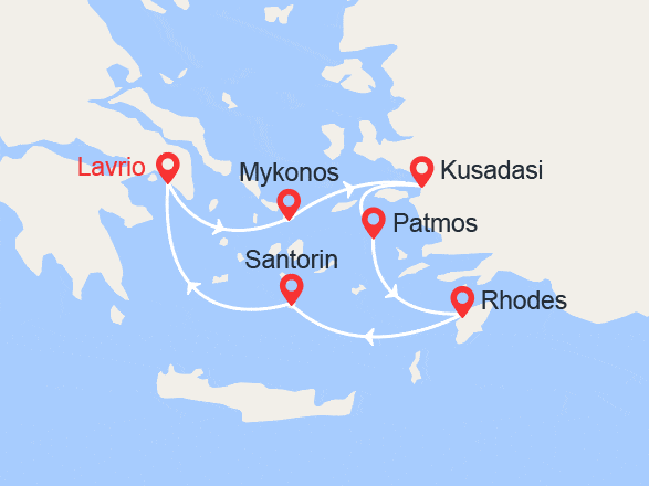 Athènes (Lavrio) - Mykonos (Cyclades) - Turquie (Kusadasi) - Iles grecques (Patmos) - Rhodes (Ile grecque) - Santorin (Cyclades) voir +