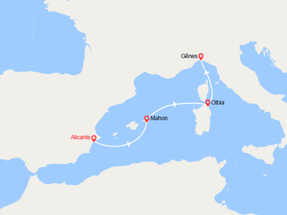 Espagne (Alicante) - Baléares (Mahon) - Sardaigne (Olbia) - Italie (Gênes) voir +