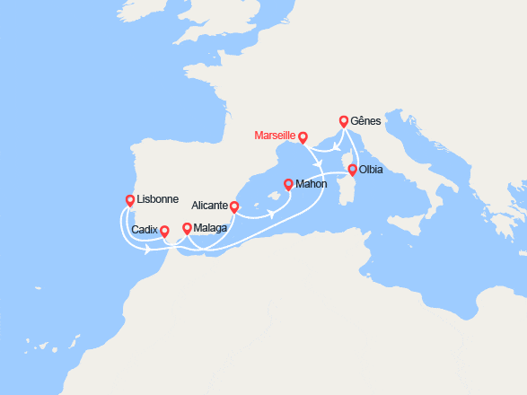 Marseille - Espagne (Malaga) - Andalousie (Cadix) - Lisbonne - Espagne (Alicante) - Baléares (Mahon) - Sardaigne (Olbia) - Italie (Gênes) voir +
