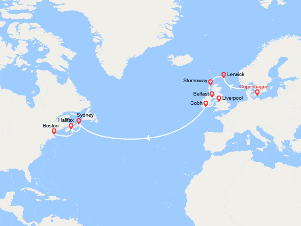 Copenhague (Danemark) - Ecosse (Lerwick) - Ecosse (Stornoway) - Irlande du Nord (Belfast) - Angleterre (Liverpool) - Irlande (Cobh) - Canada (Sydney) - Canada (Halifax) - Etats Unis (Boston) voir +