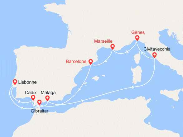 Rome (Civitavecchia) - Italie (Gênes) - Marseille - Barcelone - Gibraltar - Lisbonne - Andalousie (Cadix) - Espagne (Malaga) voir +