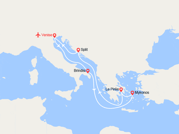 Paris - Venise - Venise Marghera - Italie (Brindisi) - Mykonos (Cyclades) - Athènes (Le Pirée) - Croatie (Split) voir +
