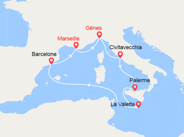 Barcelone - Marseille - Italie (Gênes) - Rome (Civitavecchia) - Sicile (Palerme) - Malte (La Valette) voir +