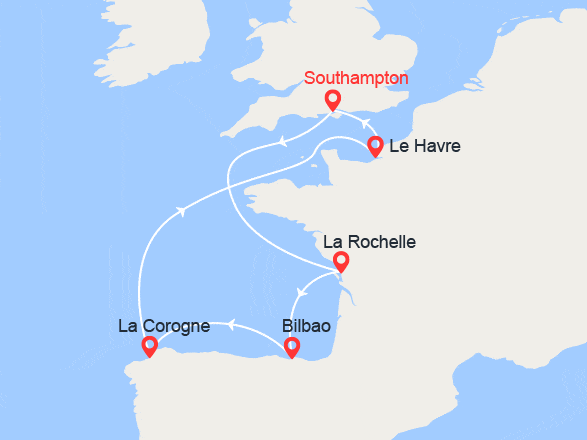 Londres (Southampton) - France (La Rochelle) - Espagne (Bilbao) - Espagne (La Corogne) - Normandie (Le Havre) voir +
