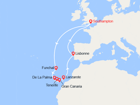 Londres (Southampton) - Madère (Funchal) - Iles Canaries (Ile de la Palma) - Iles Canaries (Tenerife) - Iles Canaries (Gran Canaria) - Iles Canaries (Lanzarote) - Lisbonne voir +