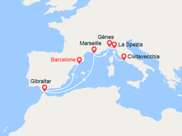 Barcelone - Palma de Majorque (Baléares) - Marseille - Corse (Ajaccio) - Italie (Sainte Marguerite) - Italie (Gênes) - Florence (La Spezia) - Rome (Civitavecchia) voir +