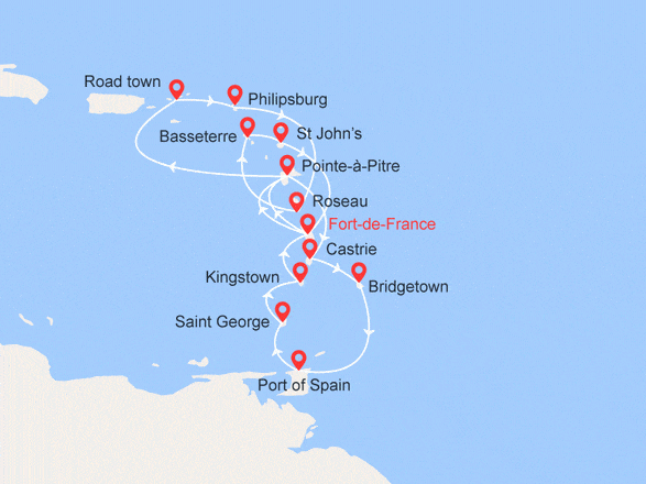 Guadeloupe (Pointe à Pitre) - Iles Vierges Britanniques (Roadtown) - St Martin (Philipsburg) - La Dominique (Roseau) - St Kitts et Nevis (Basseterre) - Antigua et Barbuda (St John's) - Martinique (Fort de France) - Ste Lucie (Castries) - La Barbade (Bridgetown) - Trinité et Tobago (Port of Spain) - Grenade (St Georges) - St Vincent et les Grenadines (Kingston) voir +