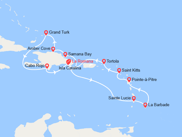 République Dominicaine (La Romana) - République Dominicaine (Isla Catalina) - République Dominicaine (Samana Bay) - Turks et Caïcos (Grand Turk) - République Dominicaine (Amber Cove) - République Dominicaine (Cabo Rojo) - Antilles (Ste Lucie) - La Barbade - Guadeloupe (Pointe à Pitre) - St Kitts et Nevis (St Kitts) - Iles Vierges Britanniques (Tortola) voir +
