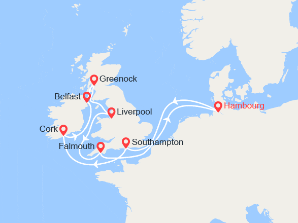 Allemagne (Hambourg) - Londres (Southampton) - Irlande (Cork) - Irlande du Nord (Belfast) - Ecosse (Greenock) - Angleterre (Liverpool) - Angleterre (Falmouth) voir +