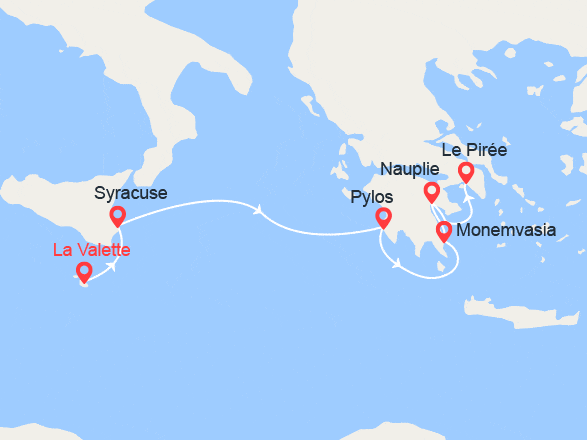 Malte (La Valette) - Sicile (Syracuse) - Grèce (Pylos) - Grèce (Monemvasia) - Grèce (Nauplie) - Athènes (Le Pirée) voir +