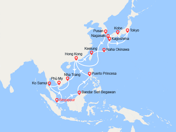 Singapour - Brunei (Bandar Seri Bagawan) - Philippines (Puerto Princesa - Palawan) - Hong Kong - Taïwan (Keelung) - Japon (Naha Okinawa) - Japon (Kogoshima) - Tokyo (Japon) - Japon (Kobe) - Japon (Nagasaki) - Corée du Sud (Busan) - Vietnam (Nha Trang) - Vietnam (Phu My) - Thaïlande (Ko Samui) voir +