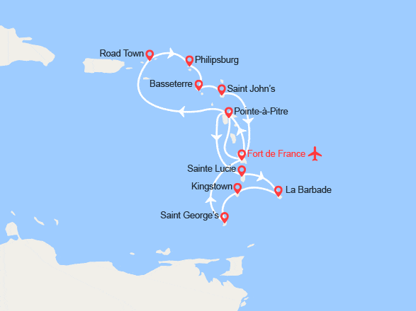Paris - Martinique (Fort de France) - Guadeloupe (Pointe à Pitre) - Iles Vierges Britanniques (Roadtown) - St Martin (Philipsburg) - St Kitts et Nevis (Basseterre) - Antigua et Barbuda (St John's) - Ste Lucie (Castries) - La Barbade (Bridgetown) - St Vincent et les Grenadines (Kingstown) - Grenade (Saint George's) voir +