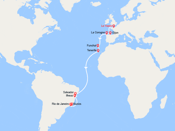 Normandie (Le Havre) - Espagne (Gijon) - Espagne (La Corogne) - Madère (Funchal) - Iles Canaries (Santa Cruz de Tenerife) - Brésil (Salvador de Bahia) - Brésil (Ilheus) - Brésil (Buzios) - Rio de Janeiro voir +