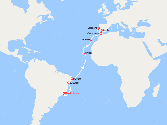 Rio de Janeiro - Brésil (Salvador de Bahia) - Brésil (Maceio) - Cap Vert (Praia) - Iles Canaries (Santa Cruz de Tenerife) - Casablanca (Maroc) - Andalousie (Cadix) - Lisbonne voir +